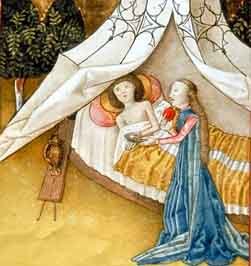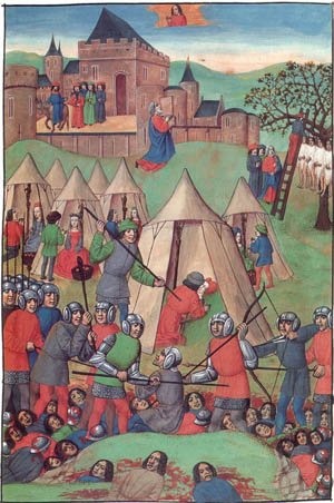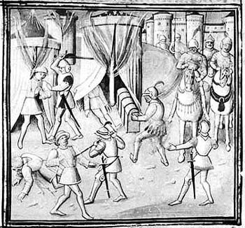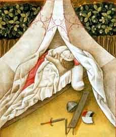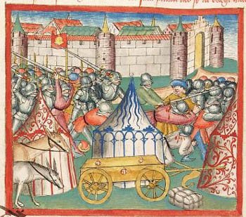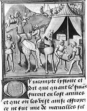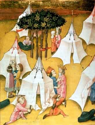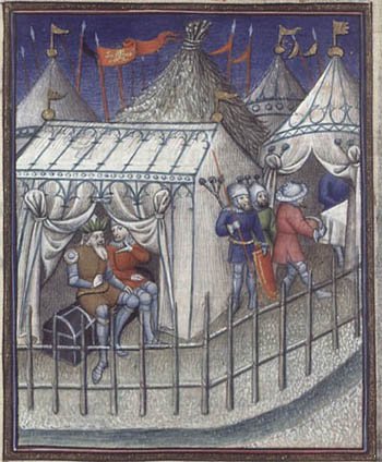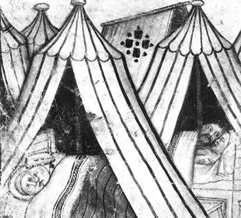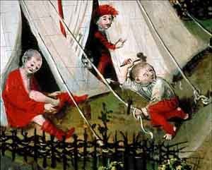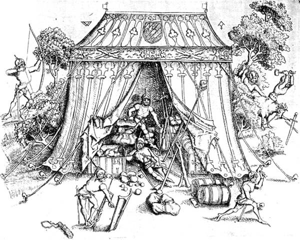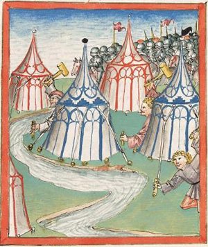 tent while their retainers set the tent up and secure guy-lines. Of note is that the personal possessions are already