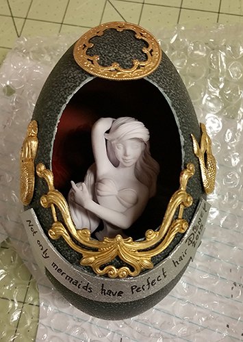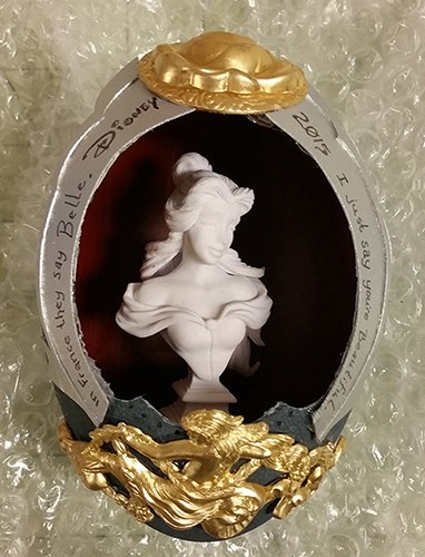 "Disney eggs" 2015. Emu Eggs, hollowed, cleaned, drilled and embellished; brass and plastics. |